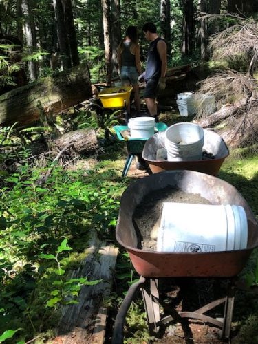 A few individuals were especially important in making this project succeed. Stacey Larson & Dave Ewart from Fisheries & Oceans identified and surveyed the locations for gravel placement with local streamkeepers; Max for organizing the Blue Jay Lake workforce and arriving with a humungous load of wheelbarrows & gear atop an all-terrain vehicle; Elijah for his expertise in setting up the zipline which facilitated minimizing the impact to the riparian zone; Helen from FOCI for dealing with much of the bureaucracy; and Esiana for fuelling us with yummy chocolate granola bars.