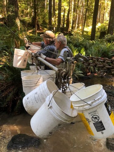 The James Creek spawning gravel project has been envisioned by streamkeepers for some years. Historically, early logging practises removed much of the natural spawning gravel in many creeks on the coast when logs were sluiced down creek beds. James Creek, which runs through the Children’s Forest and into Carrington Lagoon, was identified as a creek that could benefit from additional spawning gravel. The idea of a bucket brigade was hatched as a simple, hands-on project, although the simplicity evolved into a more complex project as FOCI Streamkeepers navigated the official requirements, permits and agreements from the many partners.