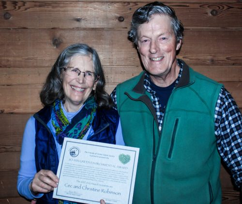 Friends of Cortes Island is delighted to announce that the winners of the Jo Ann Green Environmental Award 2017 are Christine and Cec Robinson. Ryan Harvey received a Special Honorable Mention.