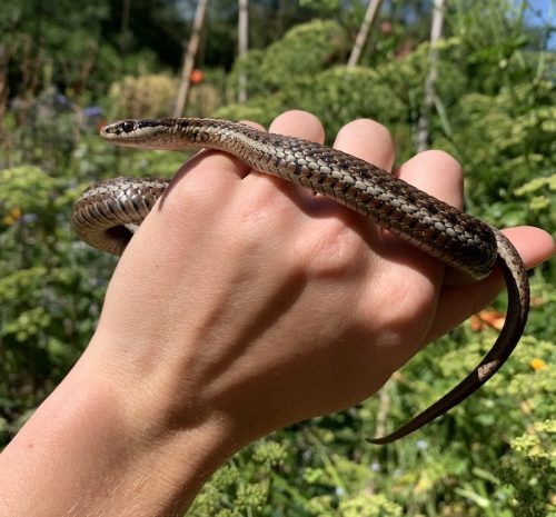 The rock wall is about 3 feet high and 20 feet long and is home to creatures like Garter Snakes and Alligator Lizards! When the snakes and lizards aren’t eating slugs and bugs off the nearby tomato plants, they spend their time sunning themselves on the warm rocks or hiding from predators in the wall’s many nooks and crannies. The key to this rock wall being such a favoured habitat by these great garden companions is that the rocks are loosely stacked on one another and not tightly mortared together.